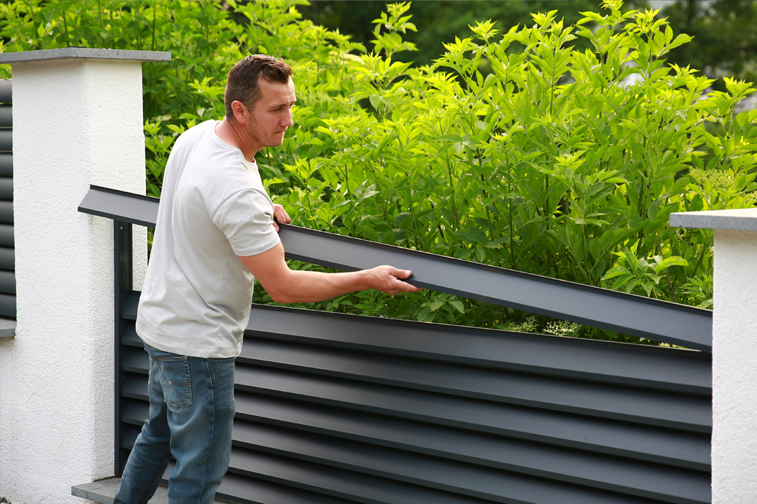 Kombinieren Sie Paneele, Pfosten, Fußgängertore und Doppelflügeltore in einem einheitlichen, farblich perfekt abgestimmten System.